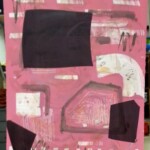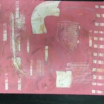 Claudia first creates a watercolor/gouache painting on BFK Rives print paper. Todd then rolls out a flat of ink to Claudia’s specifications. The ink is transferred to the plate via a roller and the watercolor painting laid down over the plate and put through the press. Claudia adds another element, this time painting ink onto the plate and transferring it onto the print. Todd and Claudia finished the above print by creating a stencil with geometric shapes and rolling the ink directly onto the print through the stencil. The underlying layers of watercolor, gouache, and printing ink create a beautifully layered image. Below are a series of images loosely documenting the process.