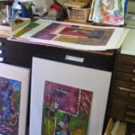 Todd visited the studio of mixed media artist Adeola Davies-Aiyeloja this afternoon for the upcoming print exhibit he is curating for Chaffey Community Museum of Art (CCMA) set for summer 2015. Todd found out about Adeola from CCMA coordinator Jenelle Lowry and was pleased and grateful to meet Adeola who graciously opened her studio up to Todd and his mother who came along for the ride. Adeola showed Todd her SolarPlate etchings of train photographs she has taken over the years as well as some of her mixed media monotype prints. Adeola told Todd about her trip to South Africa and how she is going to turn some of her train photographs into SolarPlate etchings. Although they are of contemporary South Africa they have a look of the past with a train conductor stamping tickets in antique rail cars. We can’t wait to see her final prints. These future prints combined with Adeola’s large, colorful monotypes will present a powerful coalition on the museum walls.